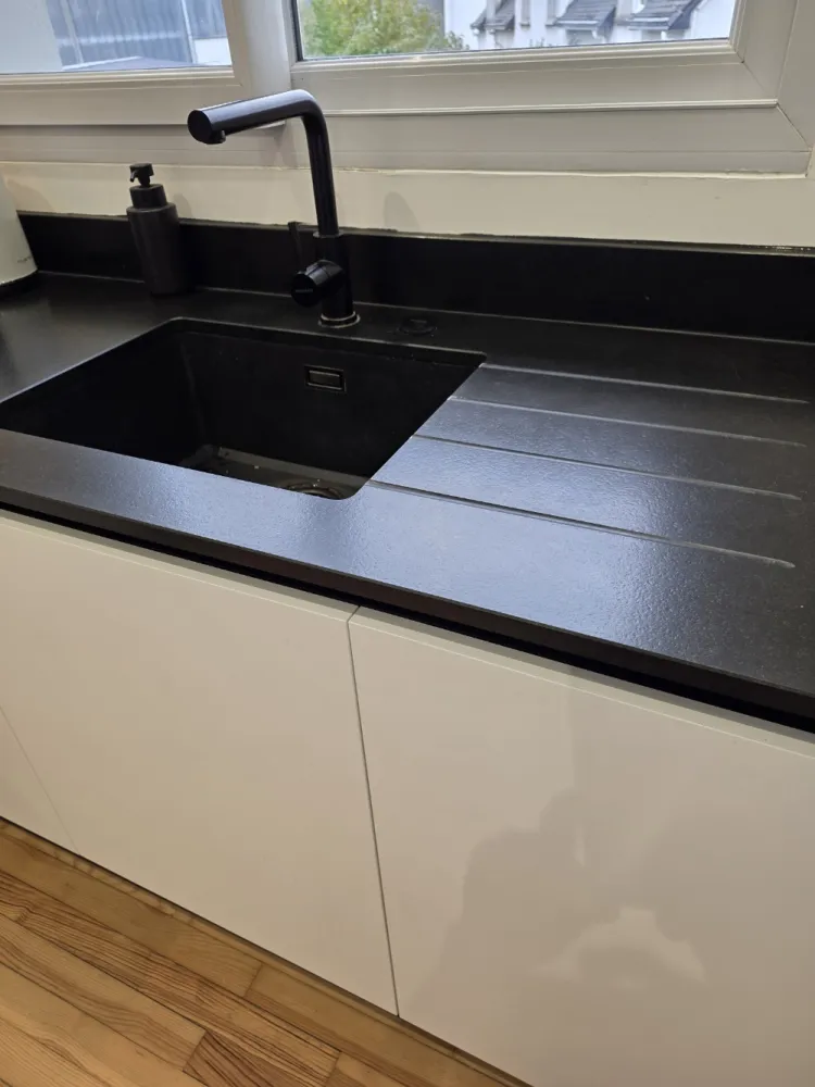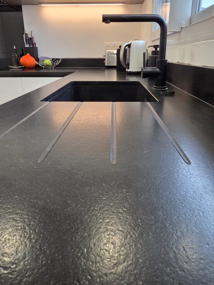 Pour le plan de travail : le coup de cœur de nos clients s’est porté sur un Granit Noir Zimbabwe finition cuir. Un choix qui allie qualité exceptionnelle et élégance naturelle. Sa couleur noire intense apportant une touche de sophistication à la cuisine, tout en restant sobre et discrète