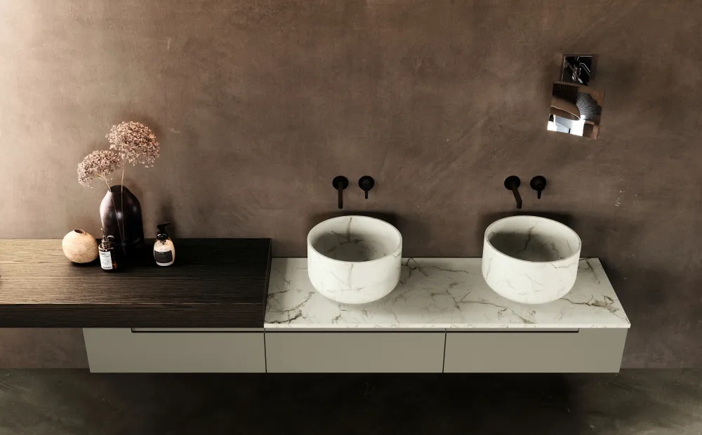 Plan vasque en Marbre Bianco Carrare, Console en Chêne Brown,